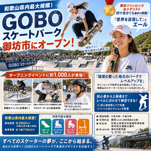 和歌山県御坊市塩屋町南塩屋の御坊総合運動公園内に、スケートボードなどが楽しめる新しい練習施設「GOBOスケートパーク」が完成し、2026年4月18日にオープニングイベントが開催されました。特別ゲストには、2021年に開催された東京オリンピックのスケートボード女子パークで金メダルを獲得した、和歌山県出身の四十住(よそずみ)さくら選手(24)が招かれ、親子連れを中心に約1000人が来場して会場は大いににぎわいました。GOBOスケートパークは、敷地面積が約2800平方メートルと、和歌山県内のスケート施設としては最大規模を誇ります。総事業費は約1億7700万円。市内のスケートファンから「市内に練習場所がほしい」という強い要望が寄せられていたことを受け、御坊市が整備を進めてきました。