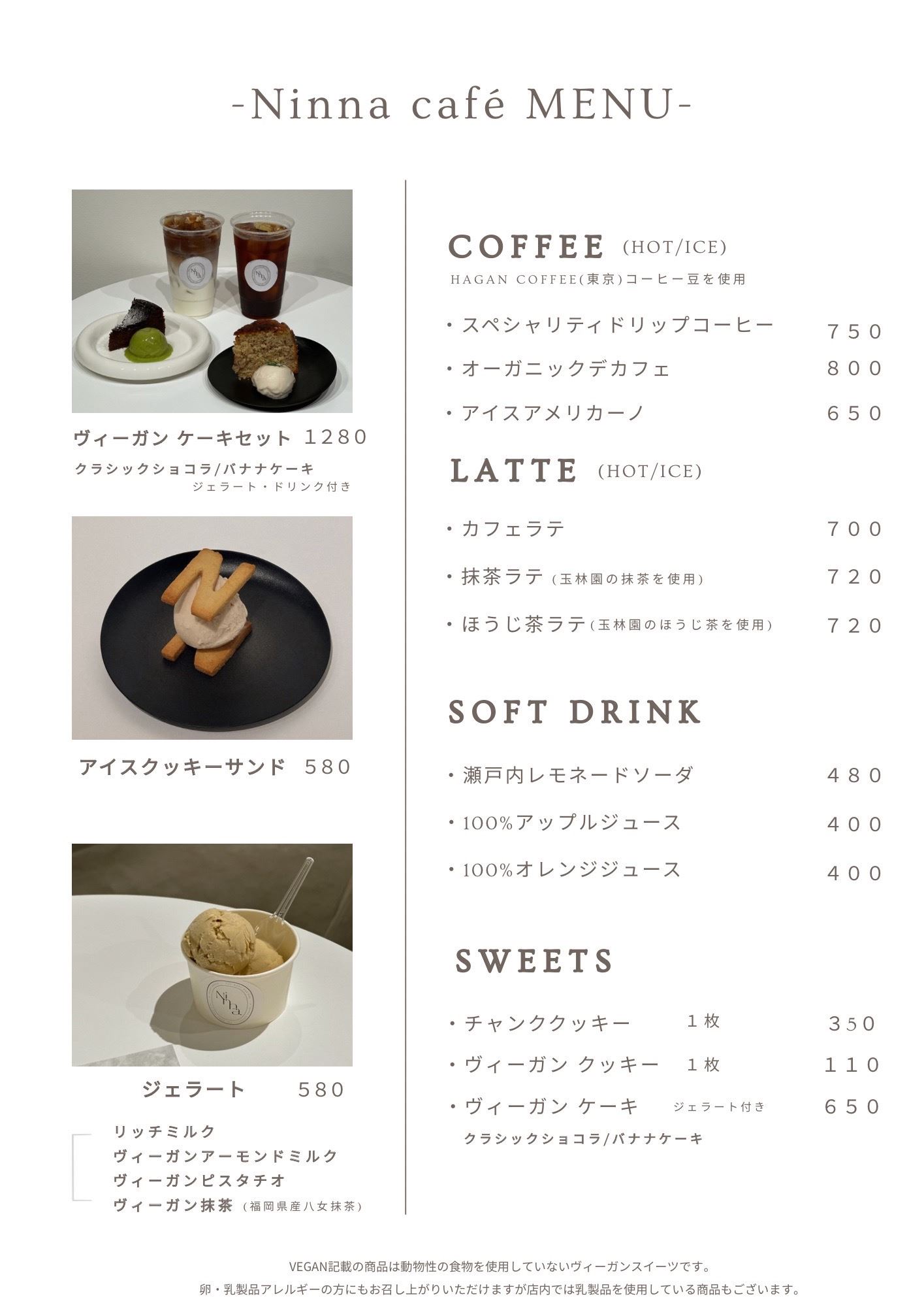 Ninna café は、子育てママとお子さまのための“やさしい居場所”。 ヴィーガンバナナケーキやジェラート、 デカフェコーヒーなど、 体にやさしいメニューをご用意しています。 おむつ替えシート完備でベビーカーも安心。 お子さまと一緒に気兼ねなくくつろげる空間で、 ゆったりとしたカフェタイムをお過ごしください。 子ども服を見て、ちょっと休憩。そんな毎日の小さなご褒美に。